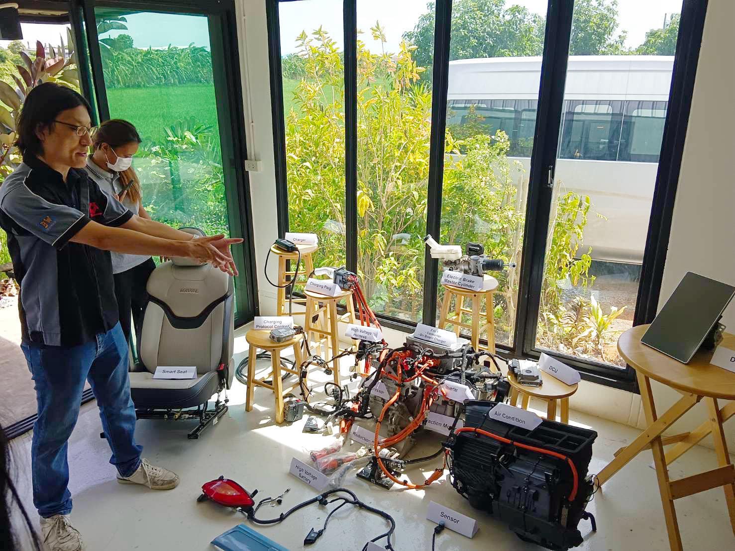 1. เยี่ยมชมชิ้นส่วนประกอบต่าง ๆ ของรถยนต์ BEV และชิ้นส่วนสำหรับยานยนต์สมัยใหม่ เช่น Motor, Inverter, Reduction Gear และระบบช่วยเหลือการขับขี่ เช่น Camera Ultra Sonic Sensor, Driver input, และ Display