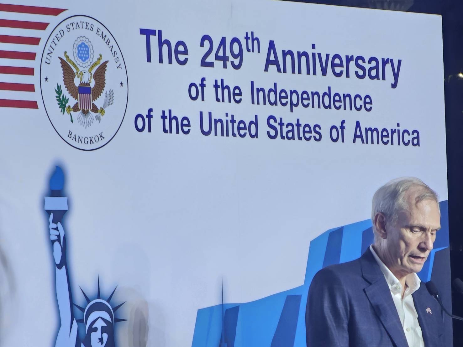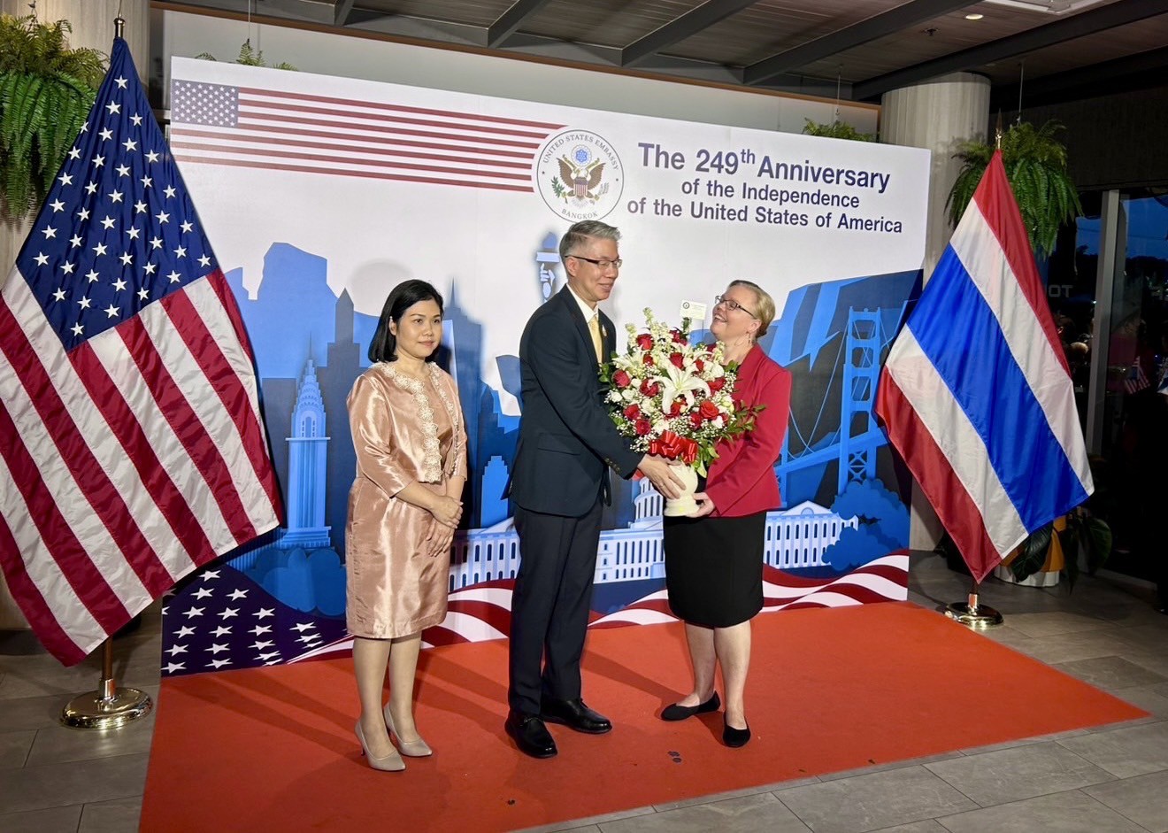 ในการนี้ ปลัดกระทรวงอุตสาหกรรมได้มอบดอกไม้แสดงความยินดีเนื่องในโอกาสครบรอบ 249 ปี แห่งการประกาศอิสรภาพของสหรัฐอเมริกา พร้อมเข้าร่วมในพิธีการ ได้แก่ พิธีแสดงขบวนพาเหรดธงชาติสหรัฐฯ โดยนาวิกโยธินของสหรัฐอเมริกา การบรรเลงเพลงสรรเสริญพระบารมี เพลงชาติไทยและเพลงชาติสหรัฐ ฯ การกล่าวสุนทรพจน์โดยเอกอัครราชทูตสหรัฐฯ ประจำประเทศไทย