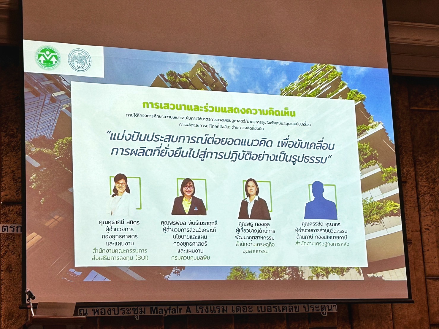 โดยมีผู้แทนจากหน่วยงานเข้าร่วมการเสวนา ได้แก่ กรมควบคุมมลพิษ สำนักงานคณะกรรมการส่งเสริมการลงทุน และสำนักงานเศรษฐกิจการคลัง ณ โรงแรมเดอะเบอร์เคลีย์ ประตูน้ำ